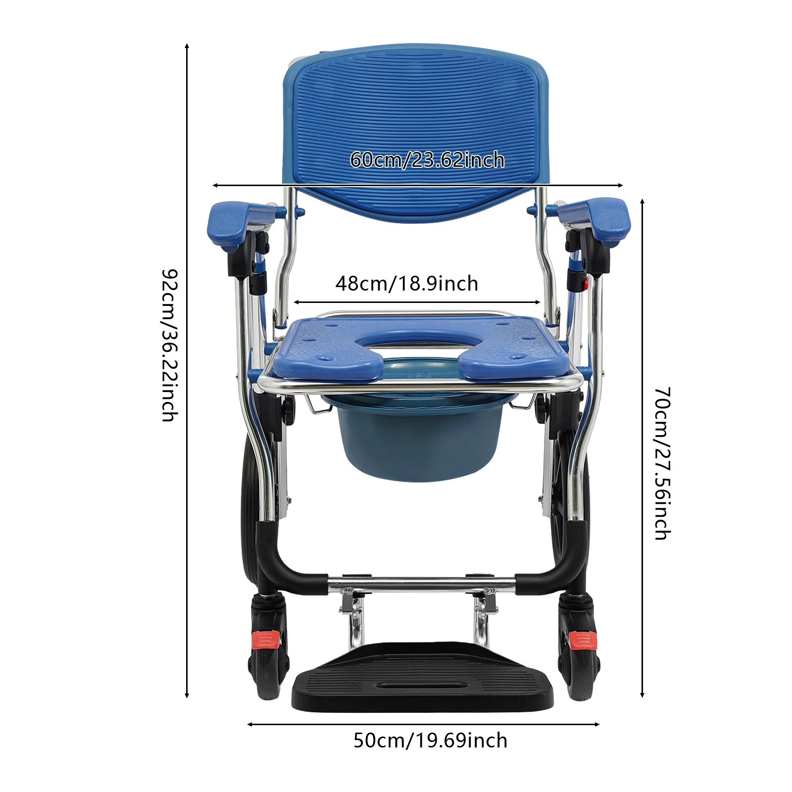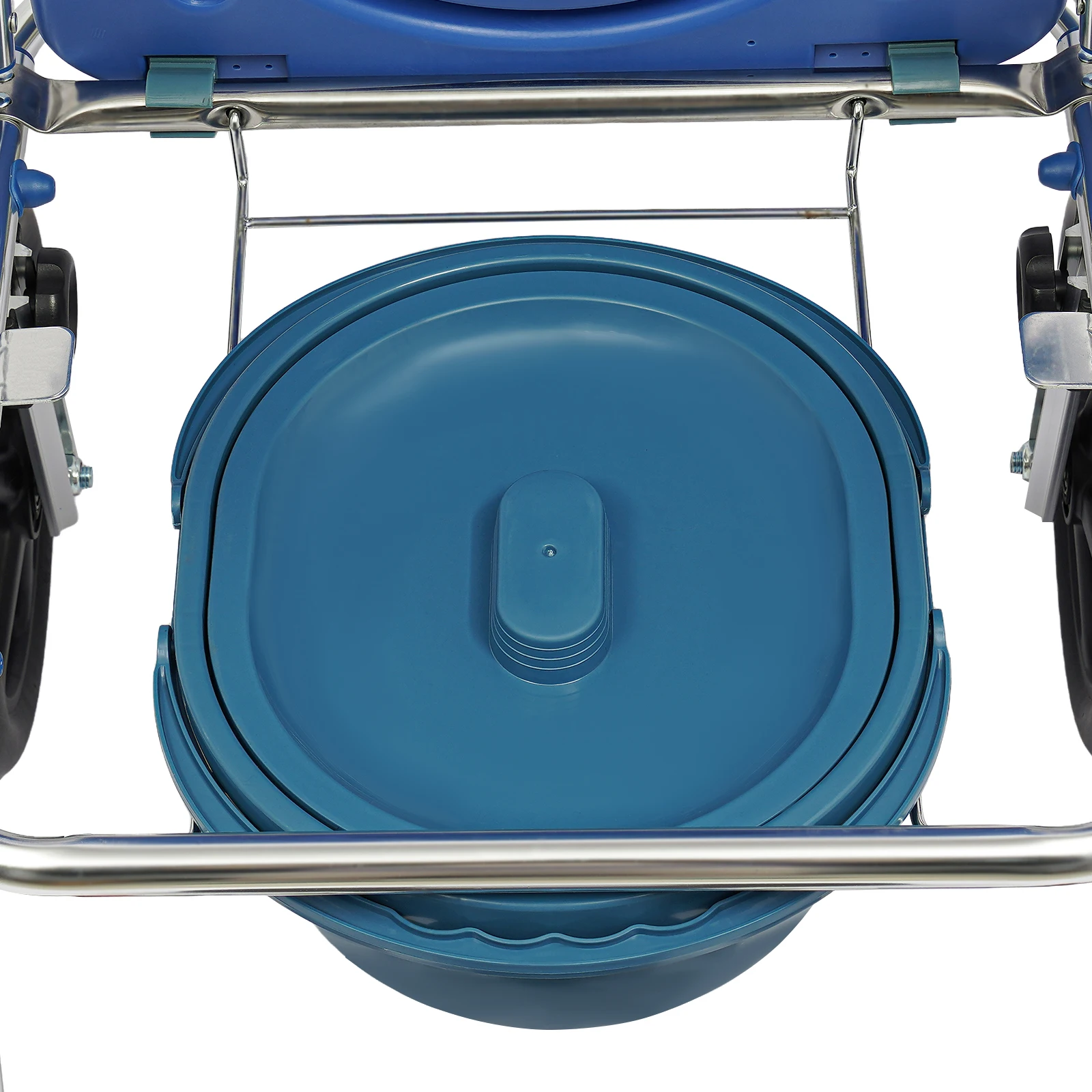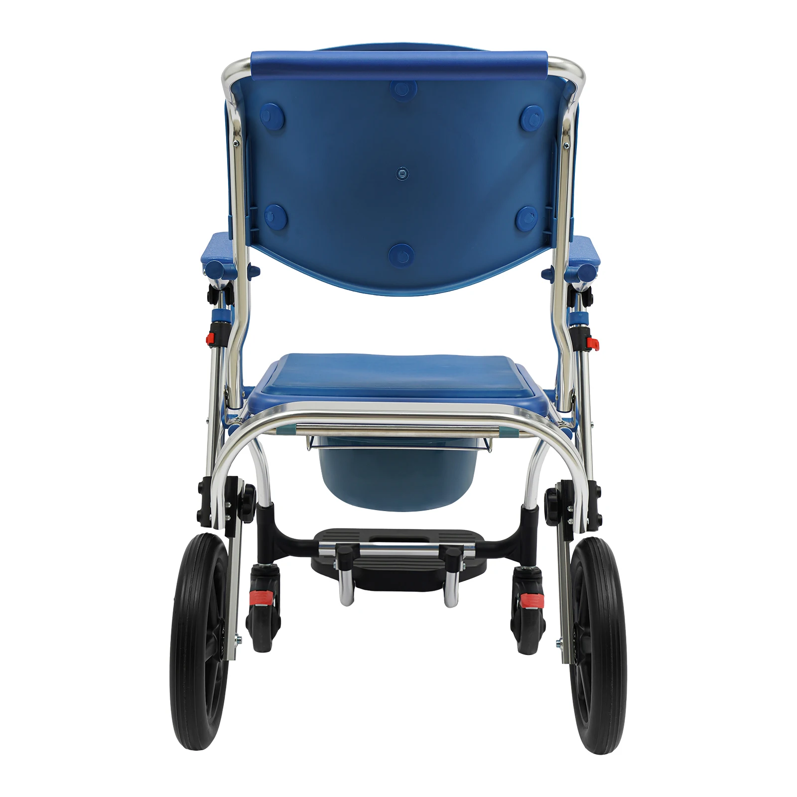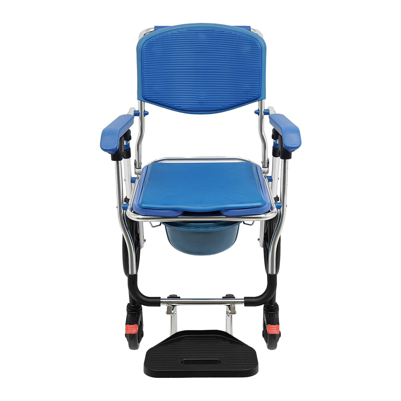 Der Rollstuhl kann direkt über der Toilette positioniert werden oder mit dem mitgelieferten Toiletteneimer genutzt werden. Dadurch eignet er sich sowohl als Duschrollstuhl als auch als Toilettenstuhl.