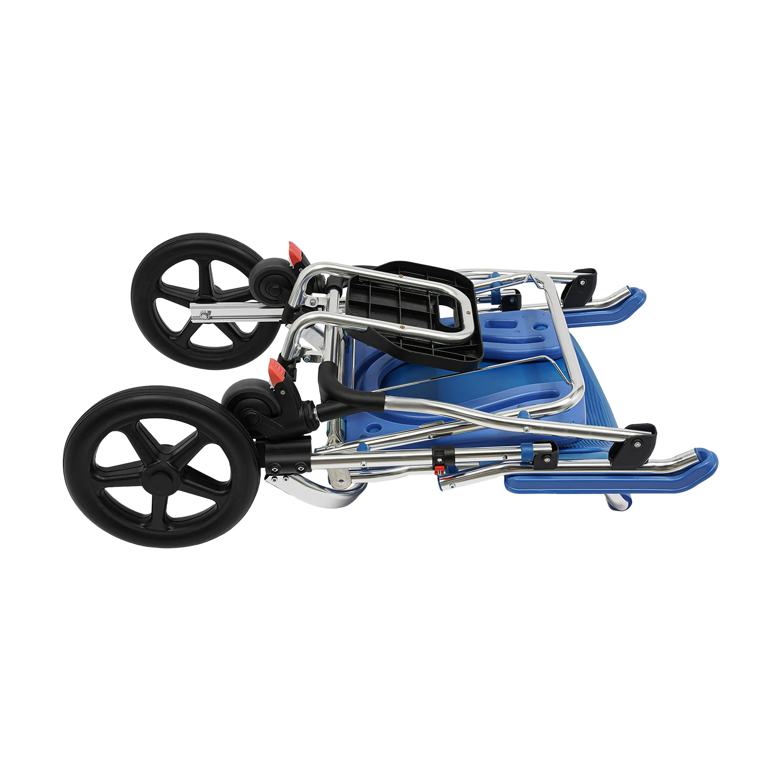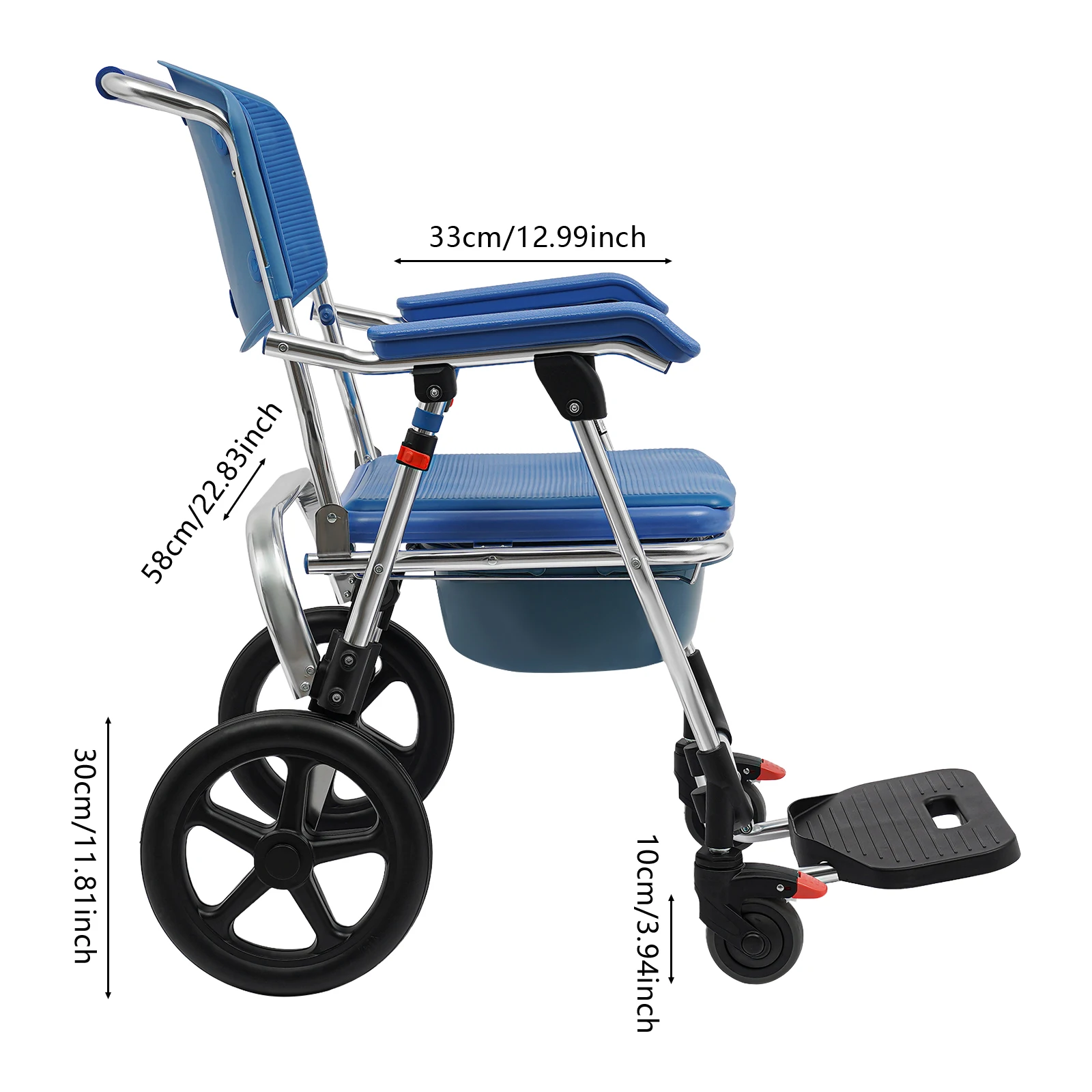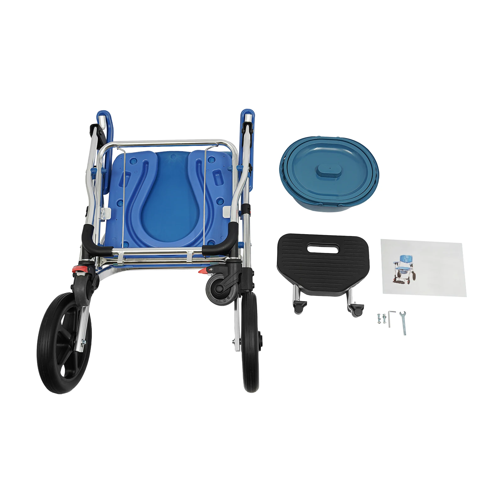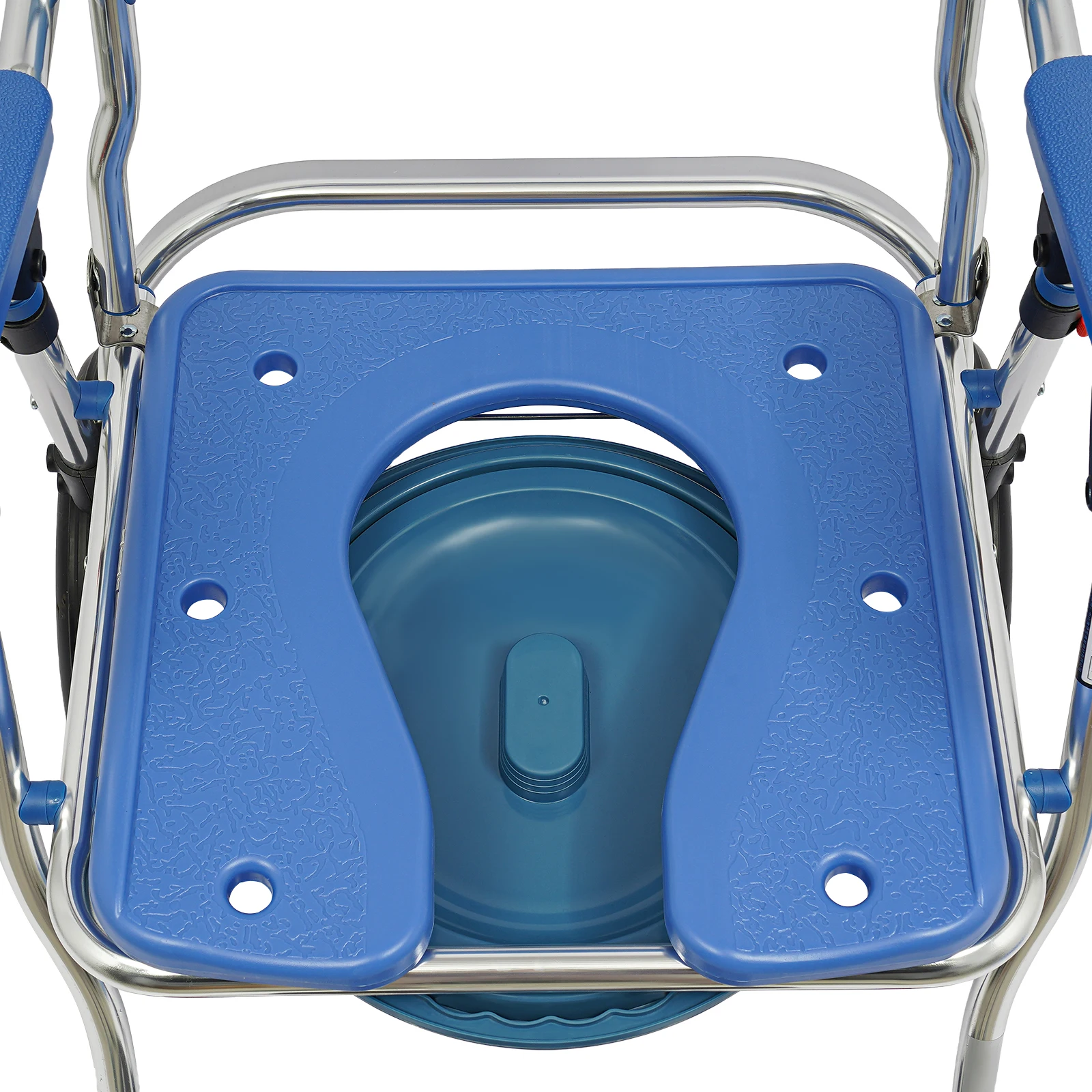 Der Rollstuhl kann direkt über der Toilette positioniert werden oder mit dem mitgelieferten Toiletteneimer genutzt werden. Dadurch eignet er sich sowohl als Duschrollstuhl als auch als Toilettenstuhl.