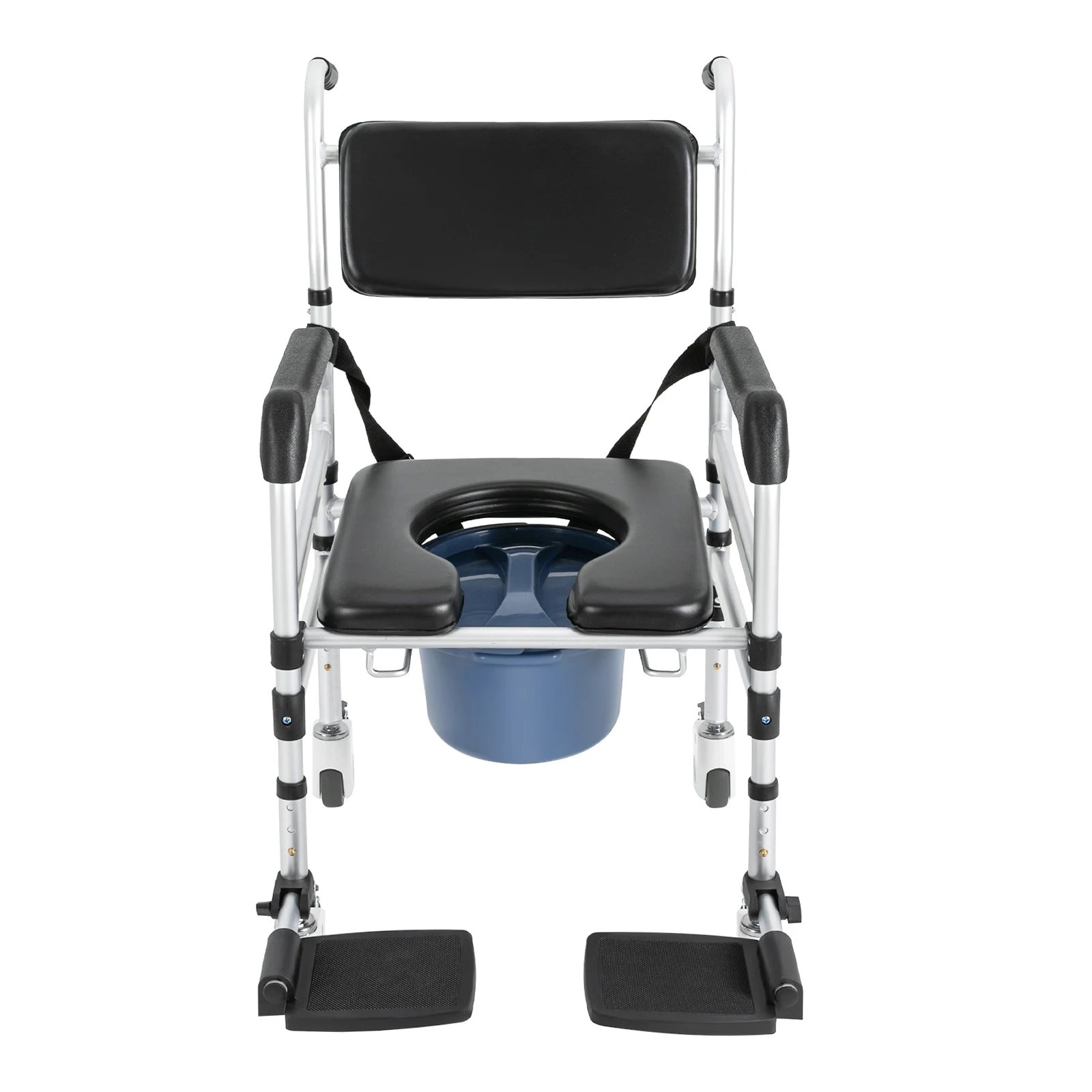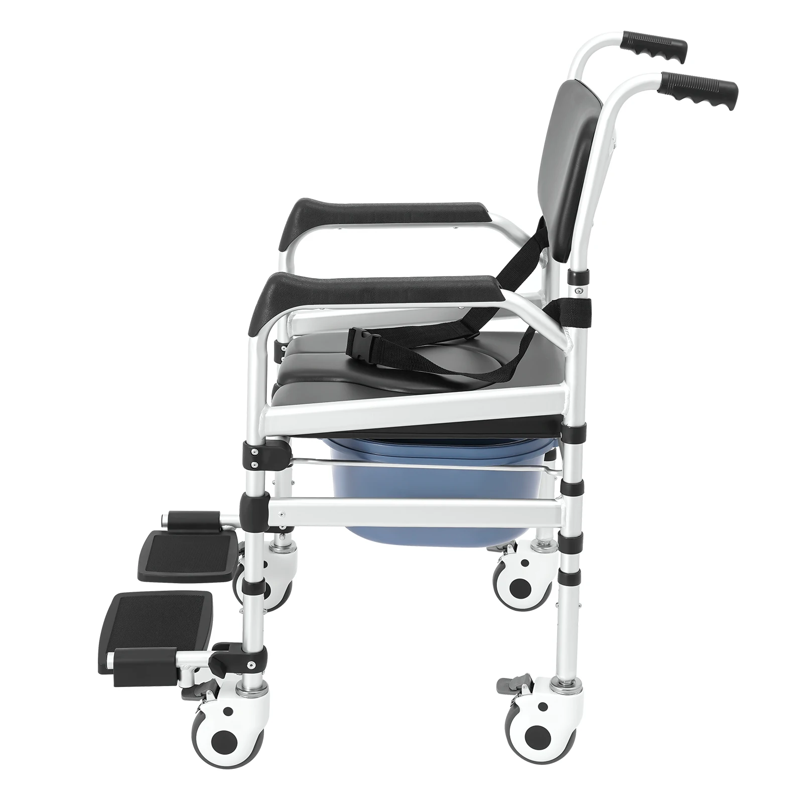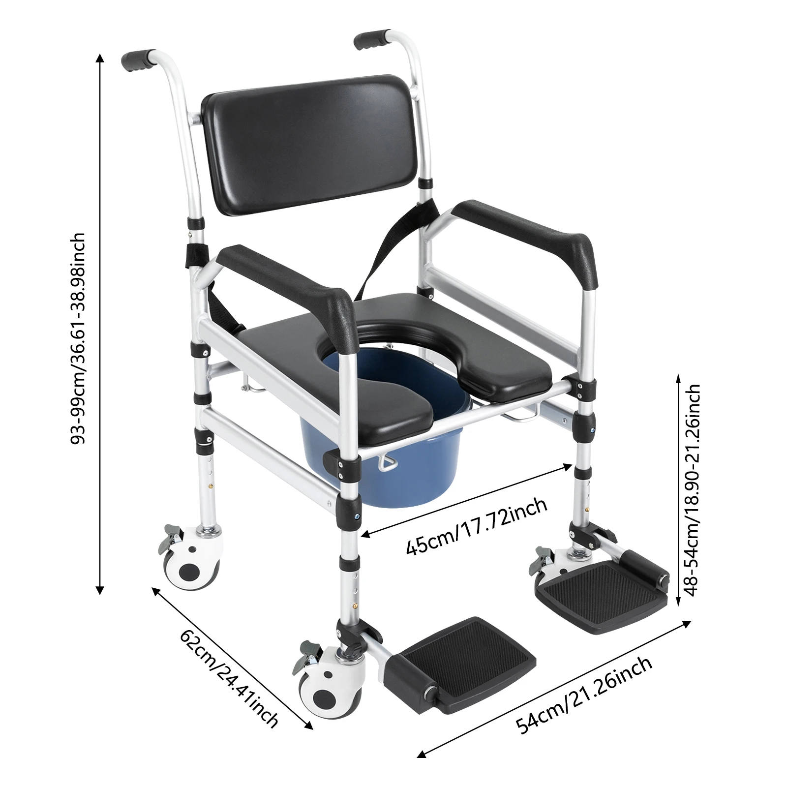 Der stabile Rahmen aus Aluminiumlegierung und PVC ist korrosionsbeständig und langlebig, wodurch der Stuhl perfekt für den Einsatz im Badezimmer geeignet ist. Dank der vier Universalräder mit Bremsen lässt sich der Rollstuhl leicht bewegen und sicher fixieren.