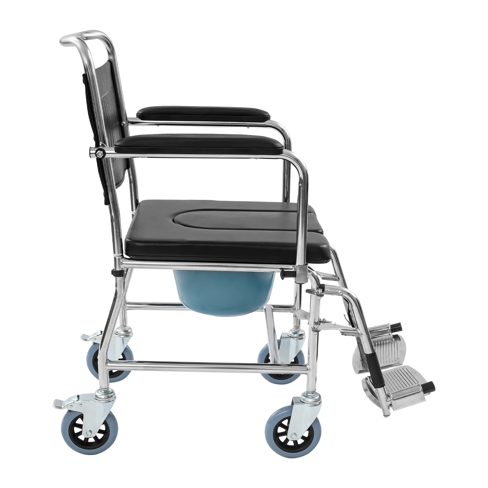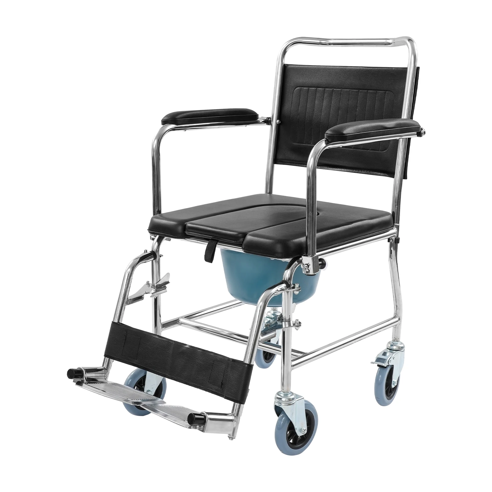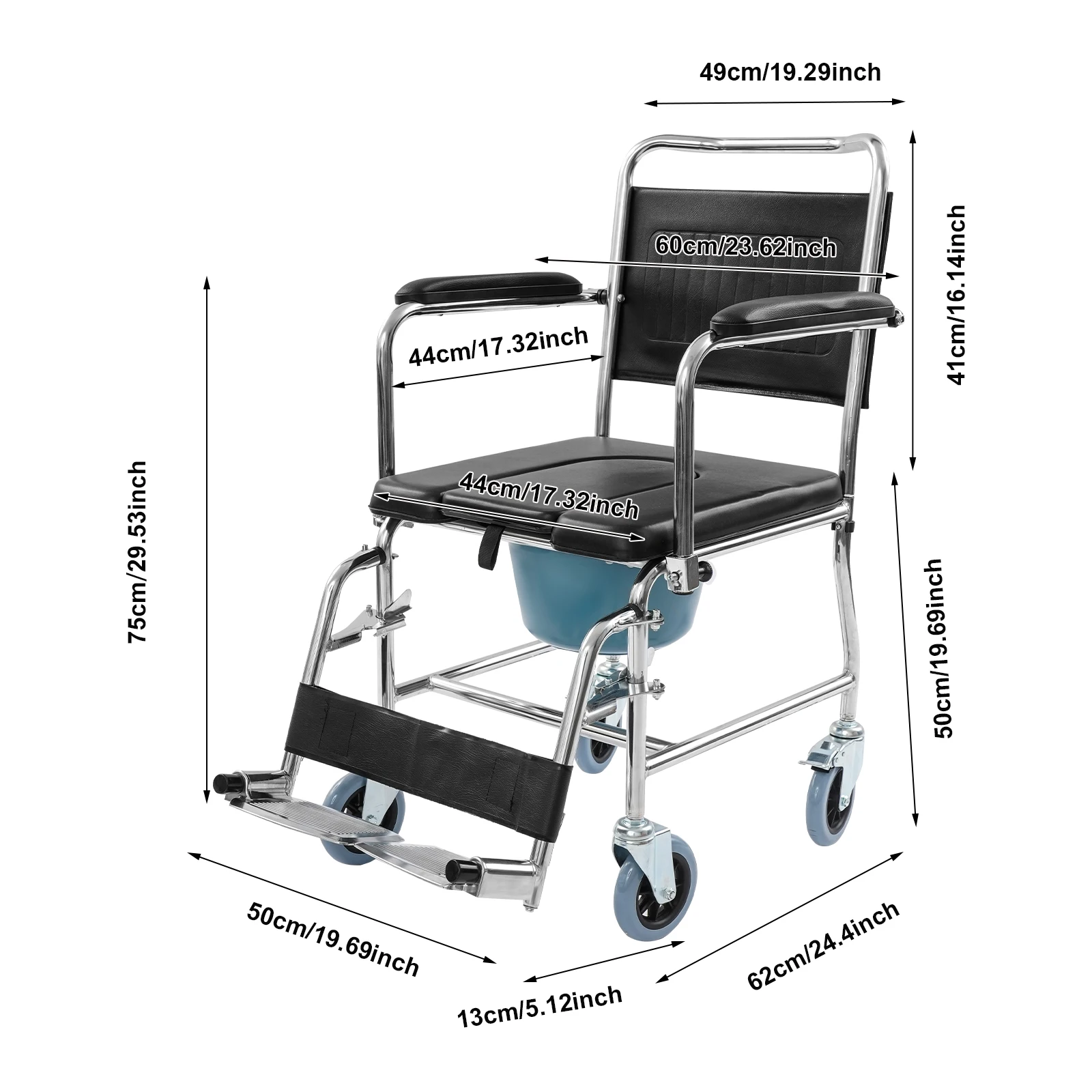 Der Rollstuhl verfügt über einen abnehmbaren Toiletteneimer mit Deckel, der eine saubere und komfortable Nutzung ermöglicht. Durch das durchdachte Design eignet sich der Stuhl ideal für eine flexible Nutzung im Alltag.